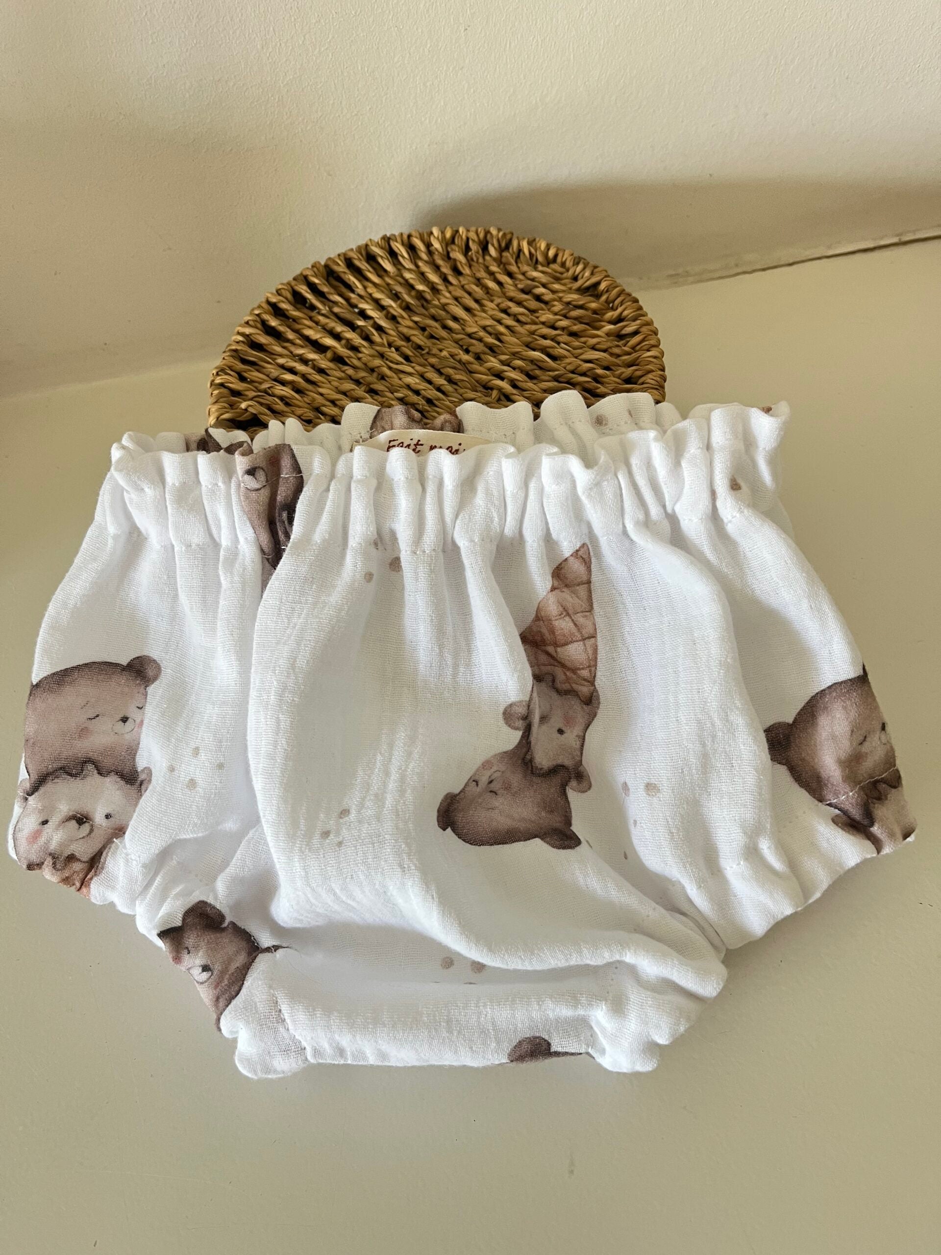 Chez Fraise et Capucine, nous proposons des culottes bloomer pour bébé faites à la main avec amour et attention.