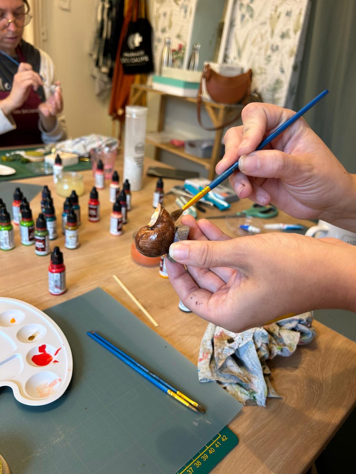 Pendant 1h30 à 2h, je vous accompagnerai pour assembler et peindre vos champignons, puis pour agrémenter votre décor de fleurs, de mousse et d'herbes spéciales maquettistes, afin de créer votre miniature unique et originale!