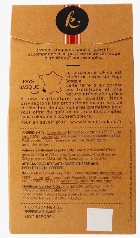 Farine de blé, fromage pur brebis AOP Ossau Iraty(18%), beurre, lait, sucre, sel, piment d'espelette(0,5%).