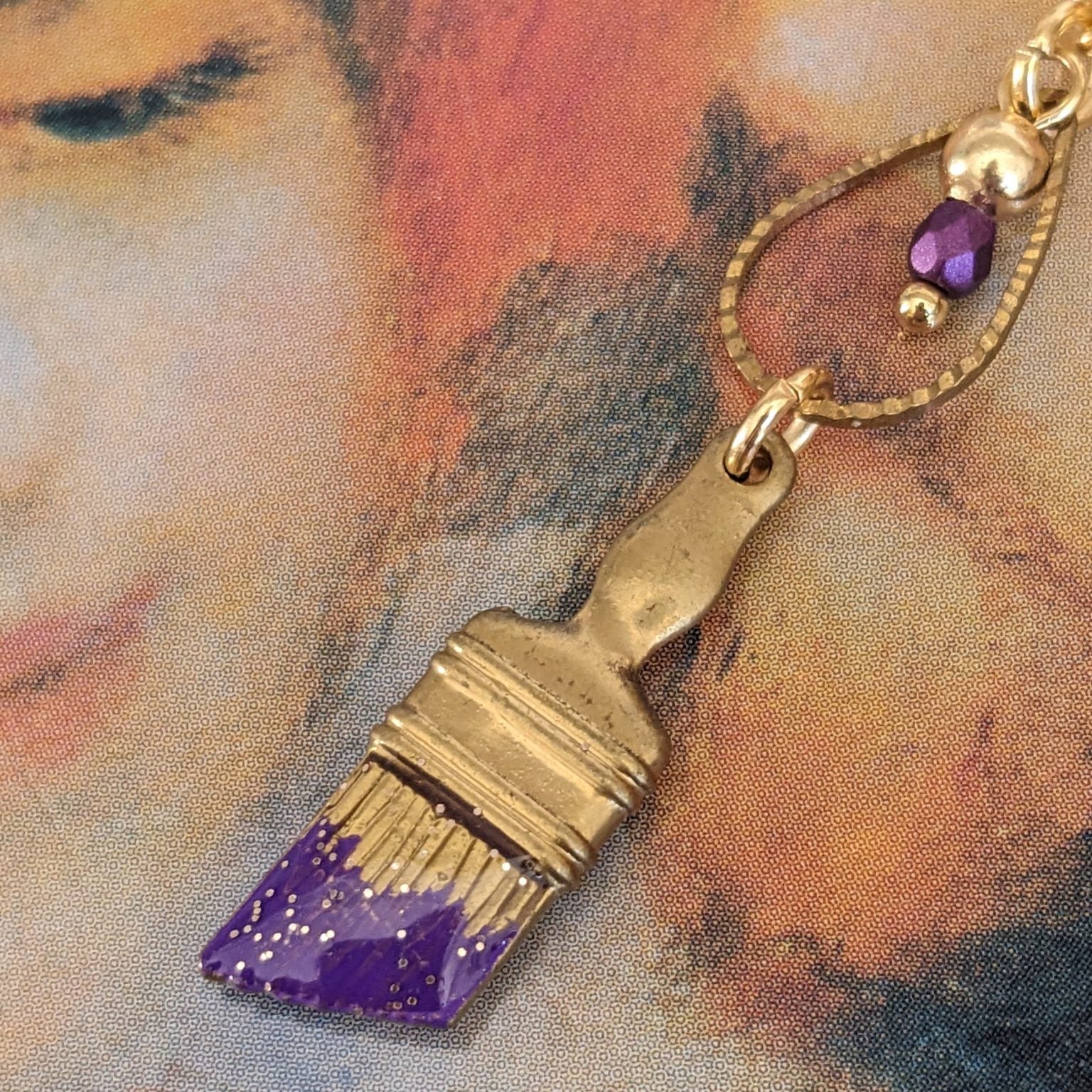 Un montage simple composé de breloques en forme de pinceaux, retravaillées à la peinture acrylique puis résinées et agrémentées de petites perles colorées.