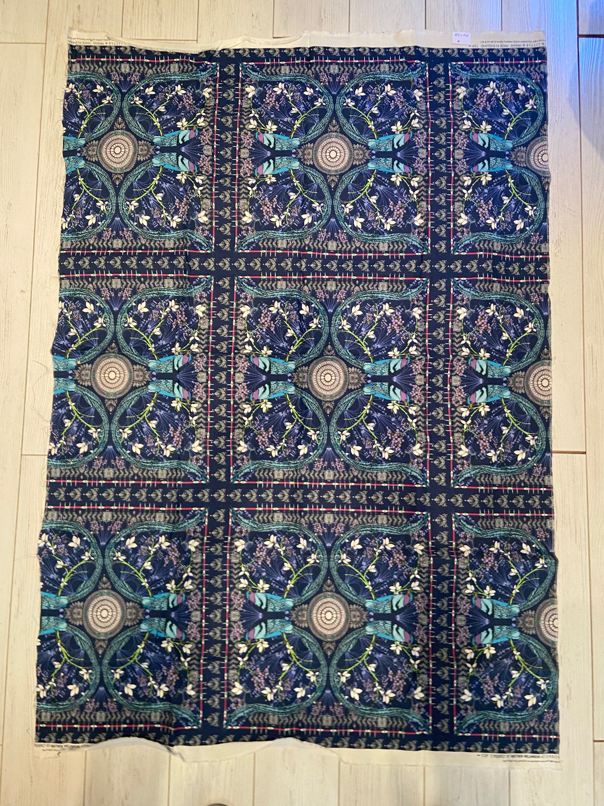 Grand motif carré en style tuile, encadré aux quatre coins par des oiseaux lyres aux longues queues incurvées, combinés à des éléments floraux de type “fleurs de cerisiers” .