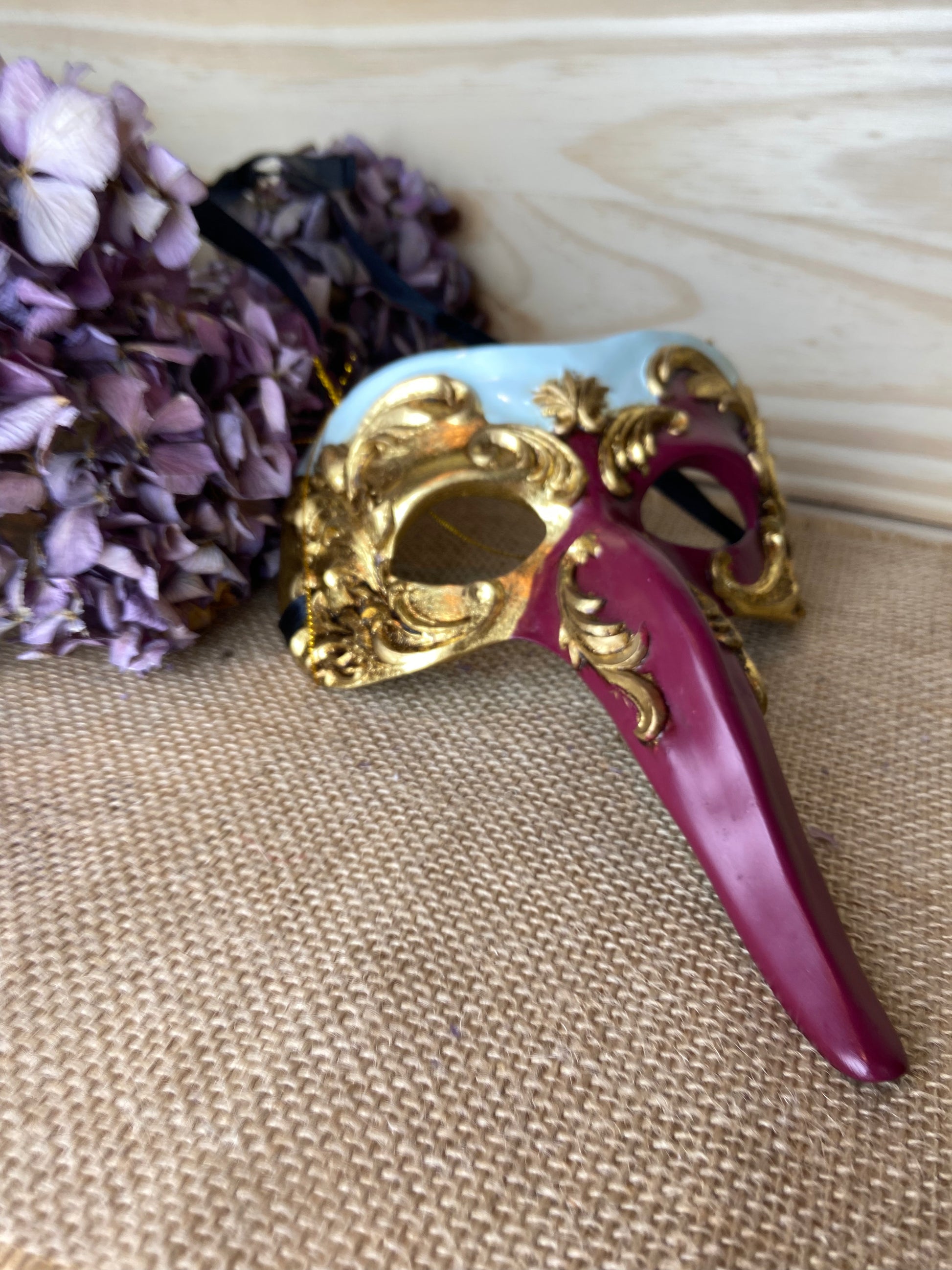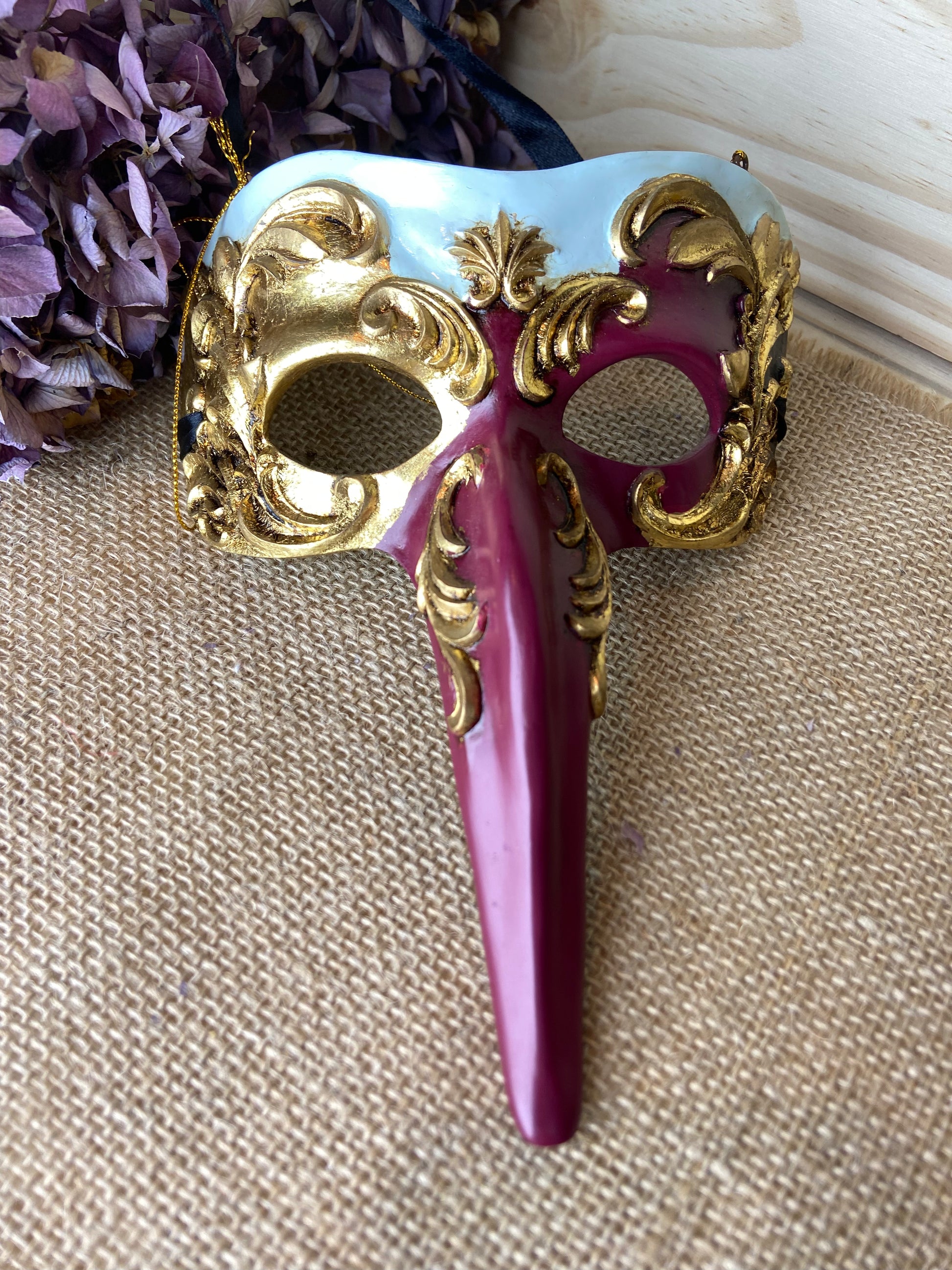 Plongez dans l’univers mystérieux et raffiné de Venise avec ce masque vénitien au long nez, orné de finitions bordeaux et dorées. Inspiré des masques traditionnels portés lors du Carnaval de Venise, il allie élégance baroque et charme théâtral.
