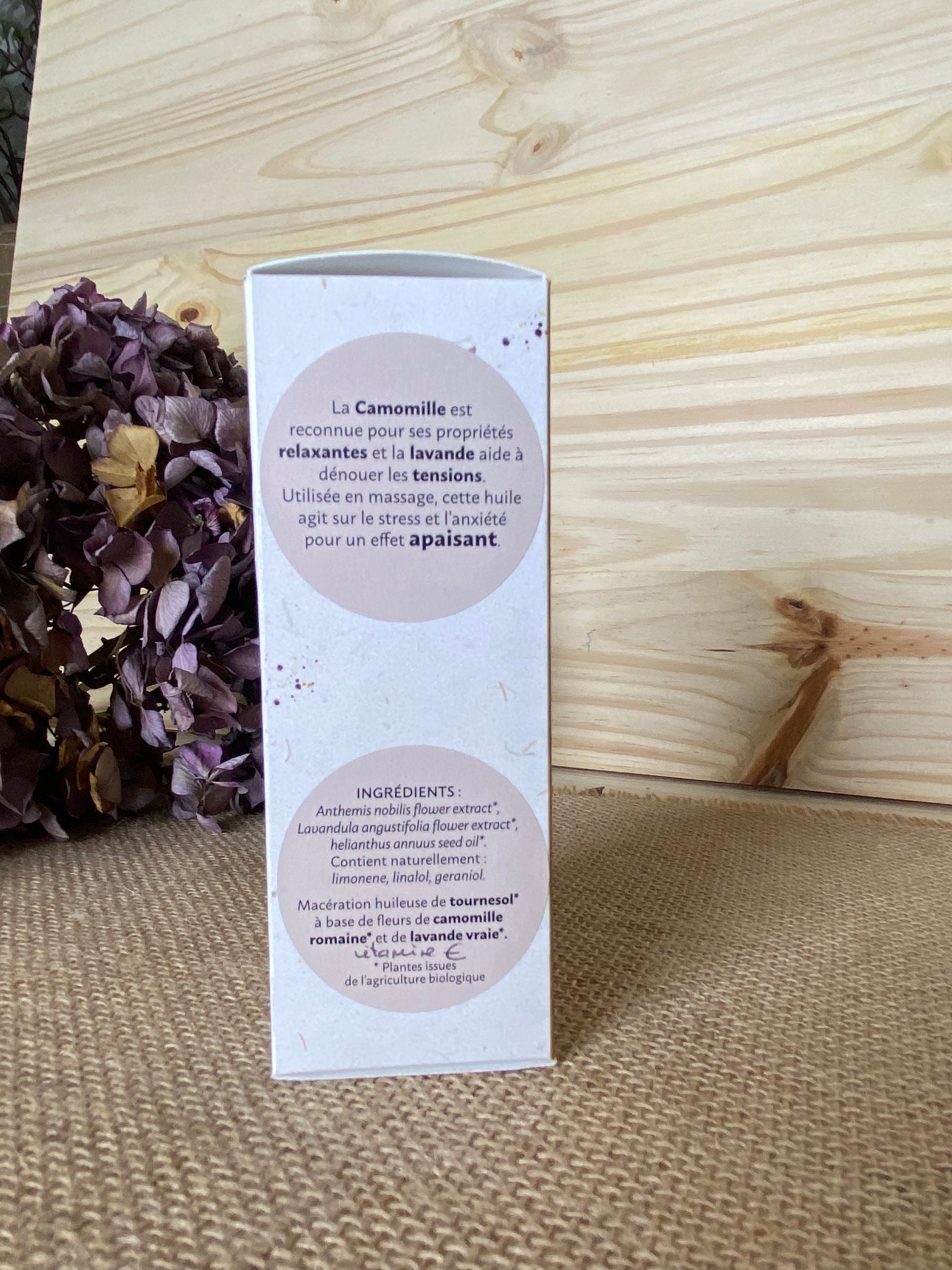 Ingrédients : Huile de tournesol*, extraits de camomille romaine* et de lavande vraie*, vitamine E naturelle*. Contient naturellement des traces de : limonène, linalol, géraniol.