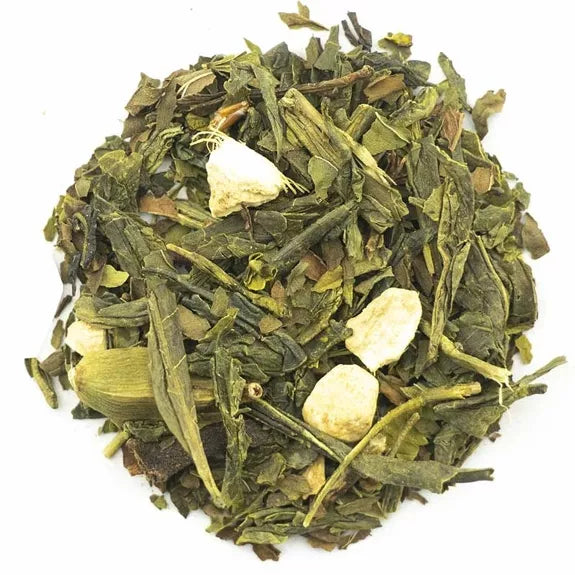 thé vert sencha, menthe poivrée, gingembre, cadamome, fenouil, clou de girofle.