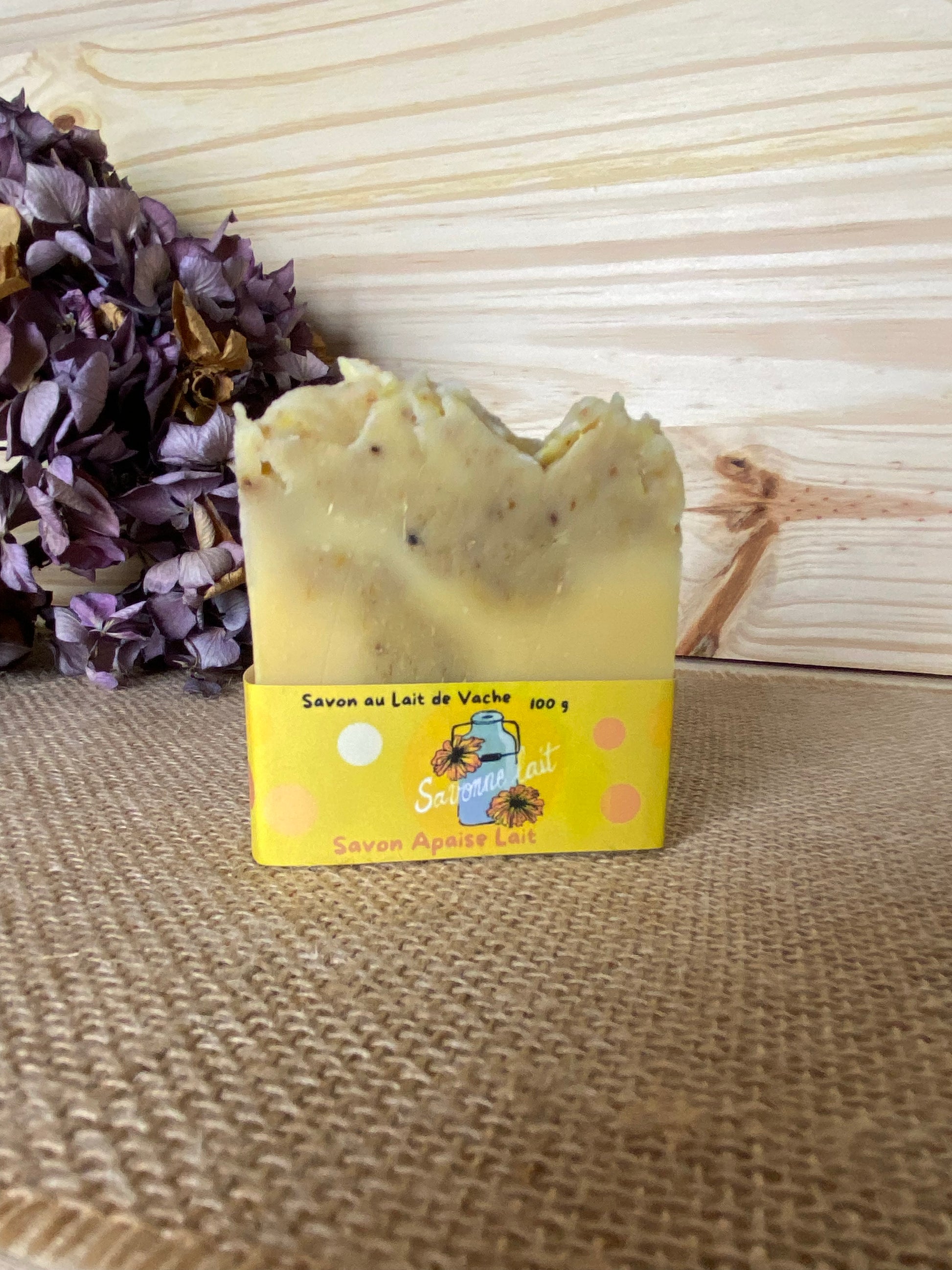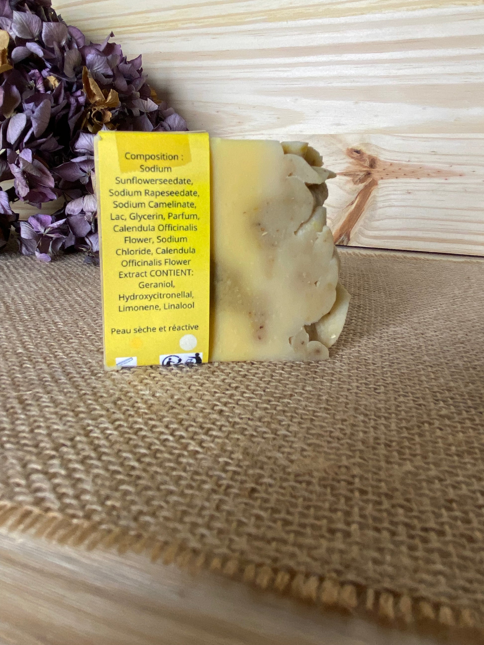 Un savon au calendula, qui sera parfait pour les peaux réactives et sèches. A base de macérat de calendula, fabriqué sur la ferme, qui est reconnu pour ses vertues réparatrices. Il embaumera votre douche d'une odeur de fleur d'oranger.