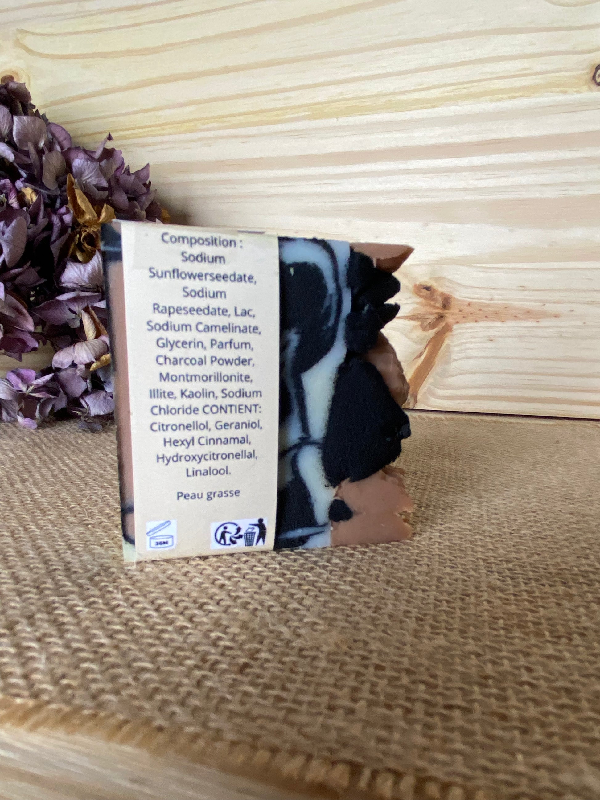 Sodium Sunflowerseedate, Sodium Rapeseedate, Lac, Sodium Camelinate, Glycerin, Parfum, Charcoal Powder, Montmorillonite, Illite, Kaolin, Sodium Chloride CONTIENT: Citronellol, Geraniol, Hexyl Cinnamal, Hydroxycitronellal, Linalool