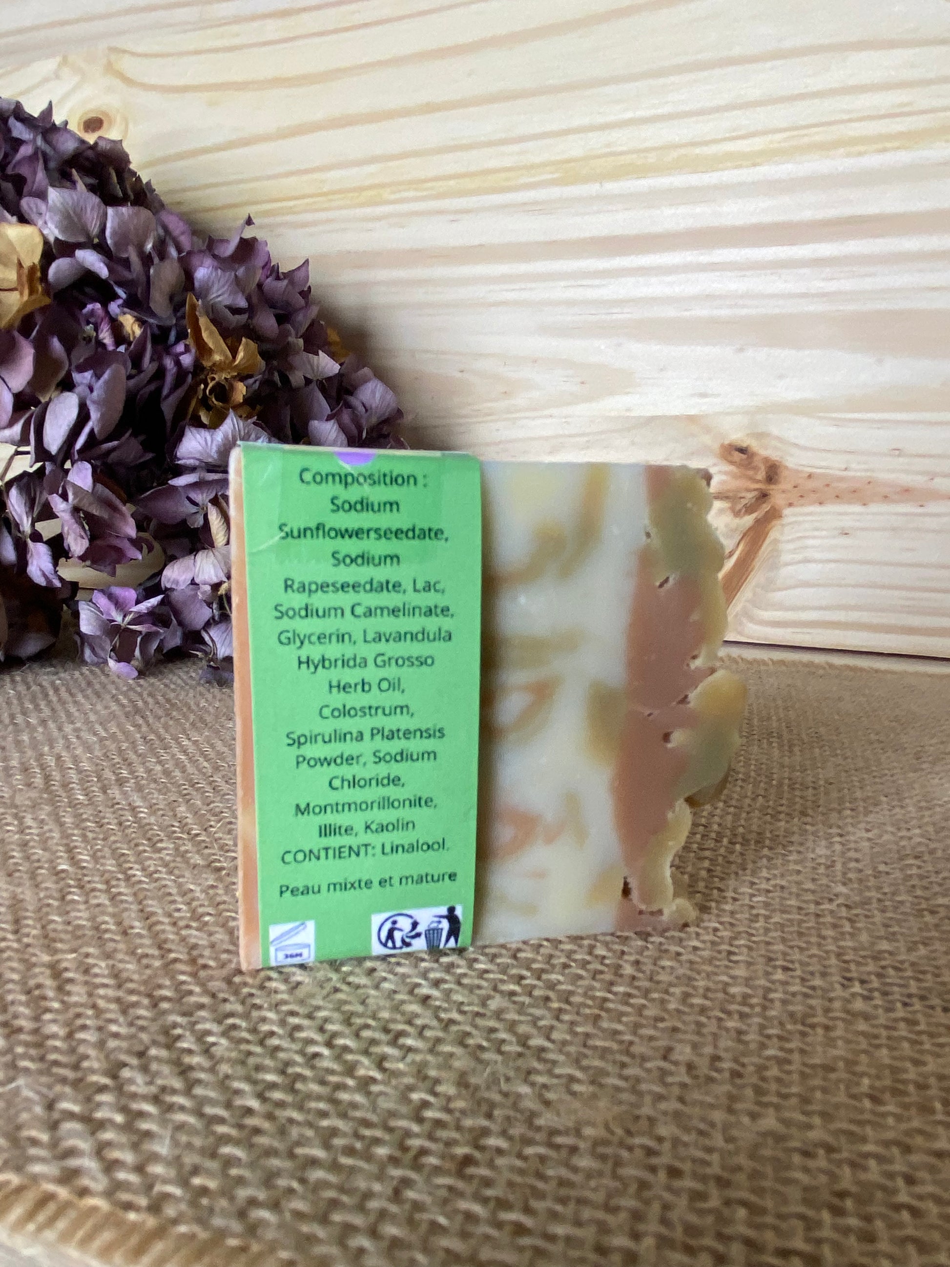 Sodium Sunflowerseedate, Sodium Rapeseedate, Lac, Sodium Camelinate, Glycerin, Lavandula Hybrida Grosso Herb Oil, Colostrum, Spirulina Platensis Powder, Sodium Chloride, Montmorillonite, Illite, Kaolin CONTIENT: Linalool.