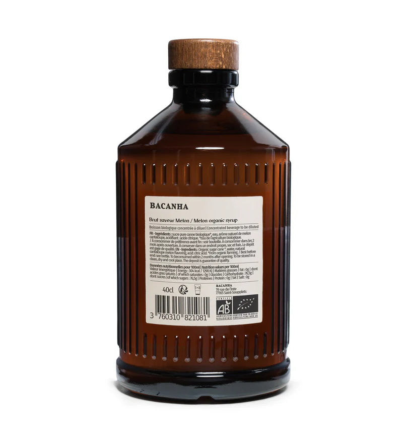 Sucre pure canne biologique, eau, arôme naturel de melon cantaloupe, acidifiant : acide citrique.