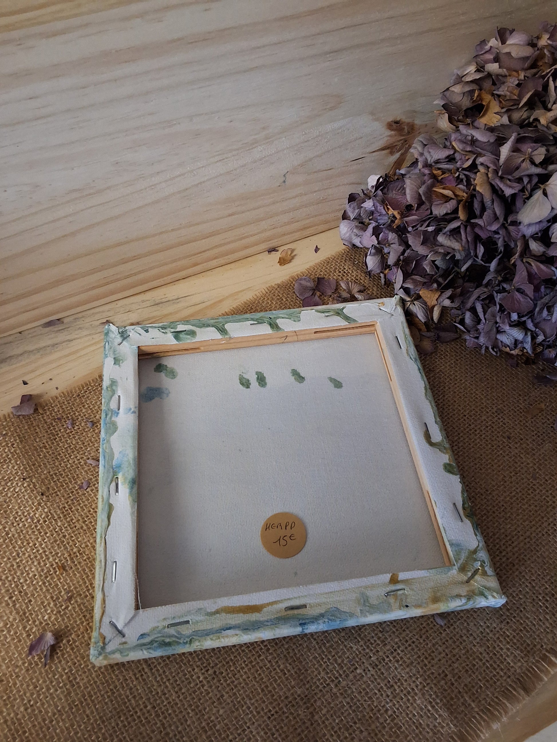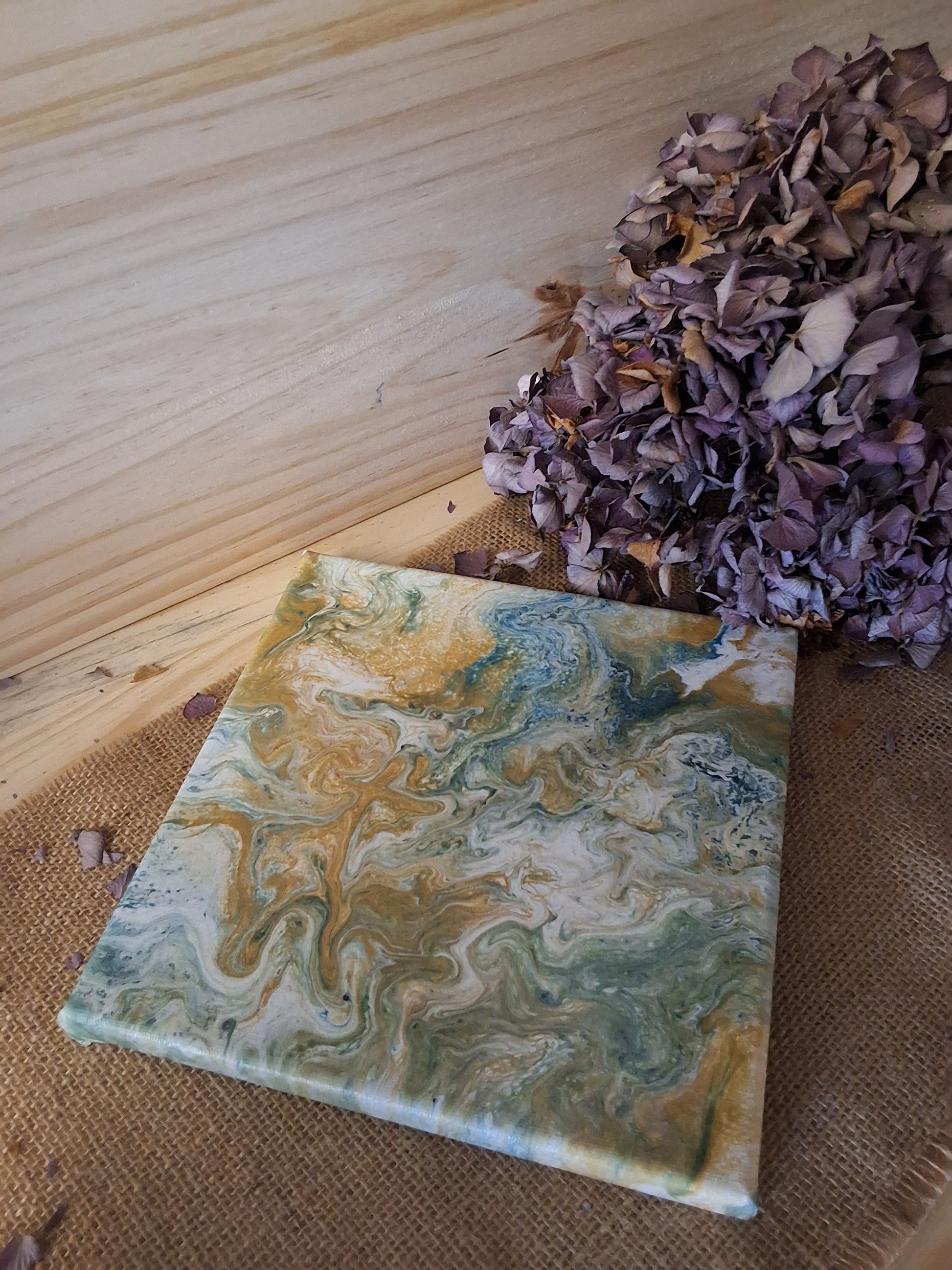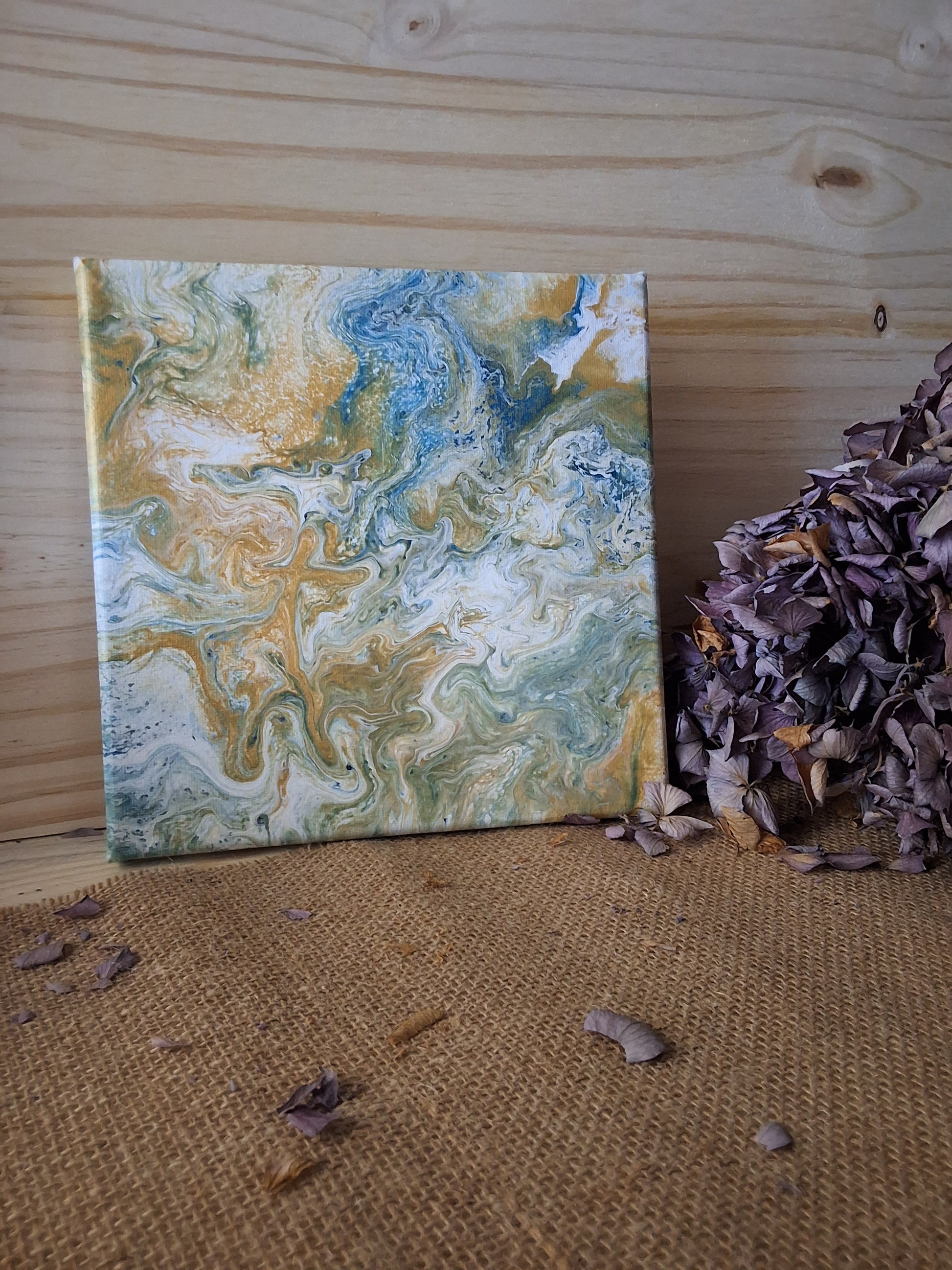 Sur cette table repose une œuvre captivante, un tableau acrylique aux teintes dorées, blanches, vertes et bleutées, où les couleurs dansent et se fondent dans un tourbillon de textures.